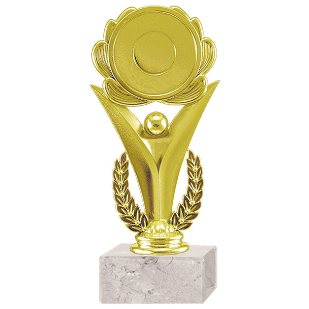 Trofeo plástico de color oro figura flor laurel portalogo para aplicación de domo. Incluye base de mármol blanca.